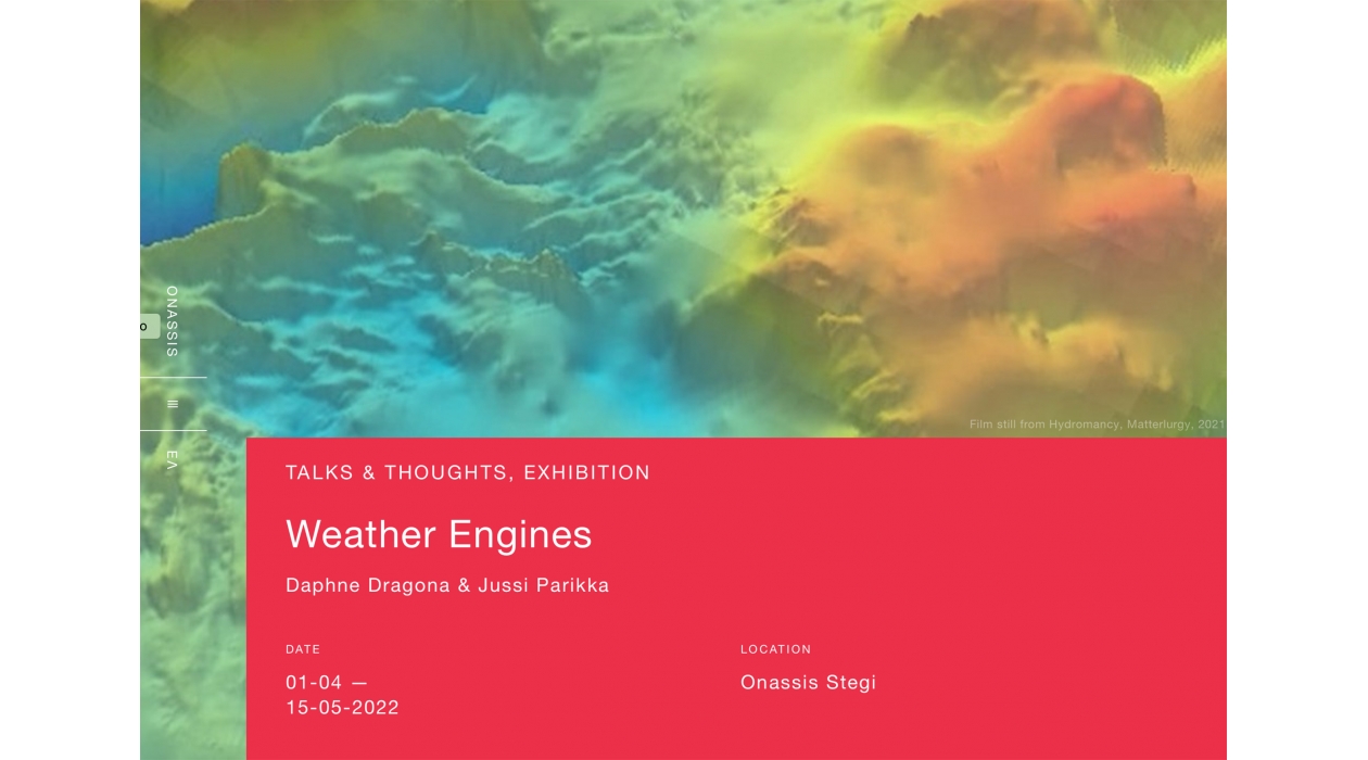 “Weather Engines” is an art exhibition and a program of talks, performances and workshops taking place at ONASSIS STEGI and the National Observatory of ATHENS (Thissio). It explores weather as a complex system, as observation and control, and as a lived experience.